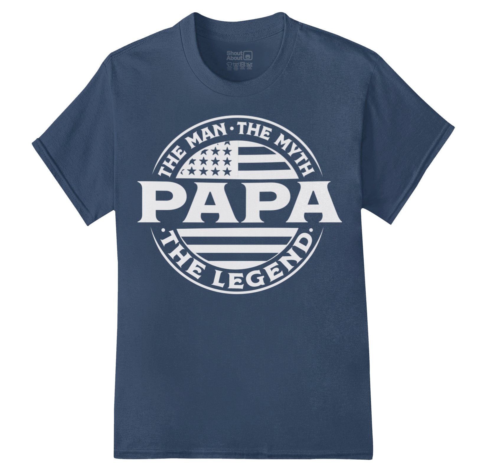 PAPA Shirt, for The man, the myth, the legend. Premium ringspun cotton shirt in Navy blue, featuring a crisp white single color print. Let your papa know he’s the best! The man, the myth, the legend will thank you as now he can let the world know he’s the worlds best papa. Show your love with a great father's day gift especially designed for your one and only PAPA. 100% combed ringspun cotton with hemmed sleeves and side seams, screen printed in the USA with attention to detail and quality control. Our team produces original artwork for every design, so you can own or gift a distinct design that is sure to bring a smile. Our shirts and hoodies make great gifts or get one for yourself to wear at home, work, the gym, heading out or chilling at home.